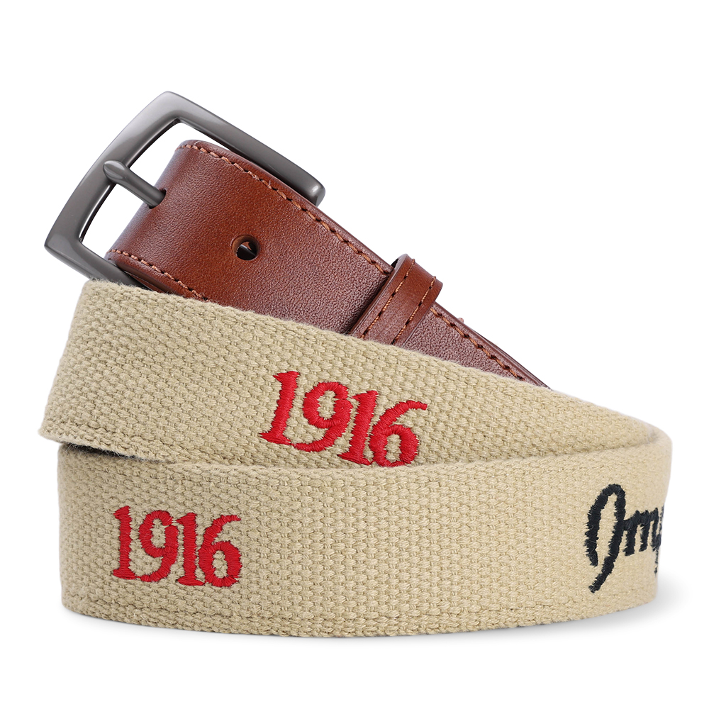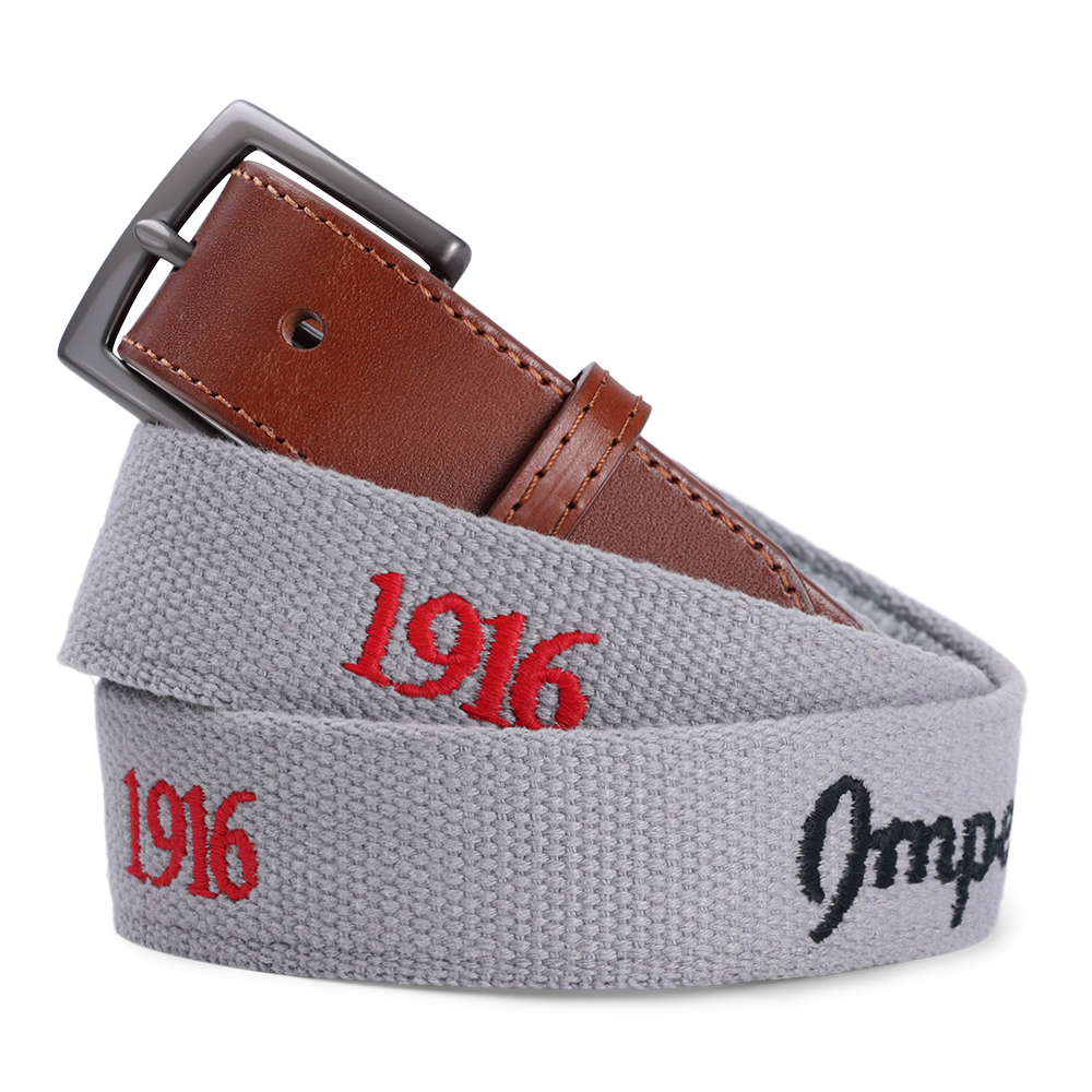 The Imperial Belt features premium cotton webbing, embroidered with original logos and finished with rich, full-grain leather and solid brass buckle plated in an elegant brushed nickel finish. Each belt is 1.25″ wide and is proudly made in the USA. For the best fit please add 2 inches to a men’s pant size, (for example, someone who wears size 36 pants would wear a 38 in Imperial belts).